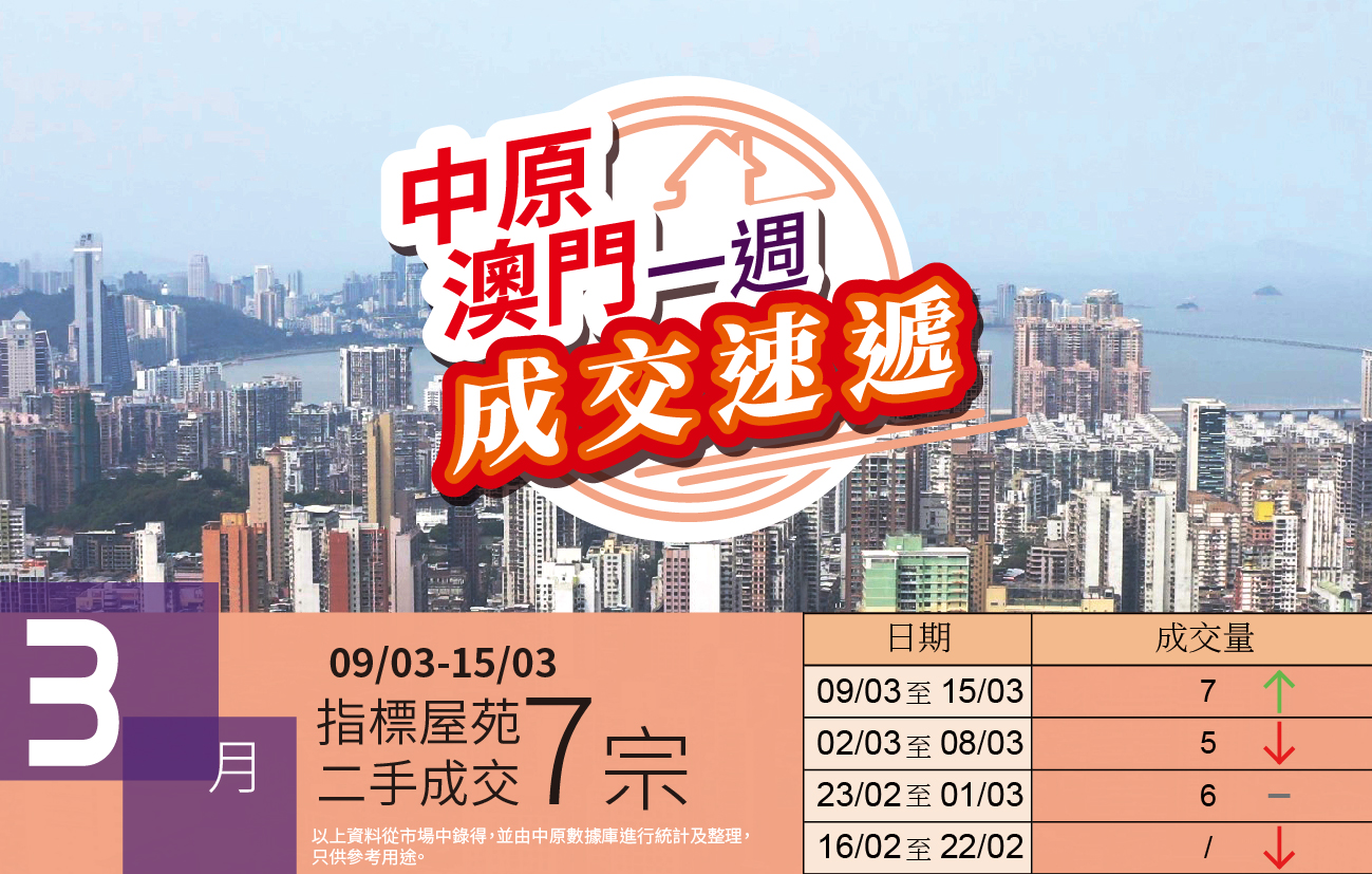 至於氹仔區方面,錄得約4宗成交,當中濠庭都會佔約2宗,兩房和三房單位分別以約688萬和890萬獲承接;而濠景花園中層兩房戶則以約468萬易手。海洋花園低層三房單位亦錄成交,呎價約4,080元。展望短期市場上用家及長線投資者均積極物色筍盤,樓市交投趨活躍,樓價同步穩中向好。